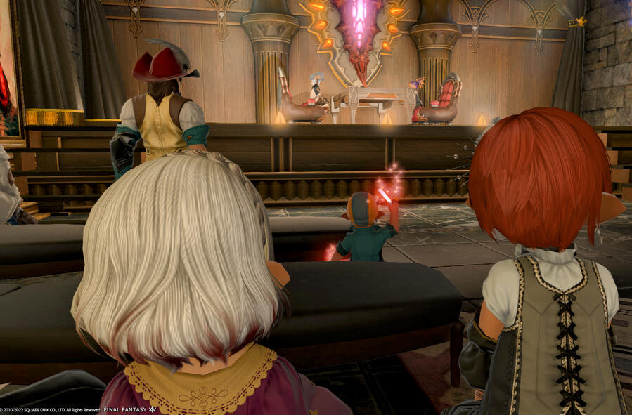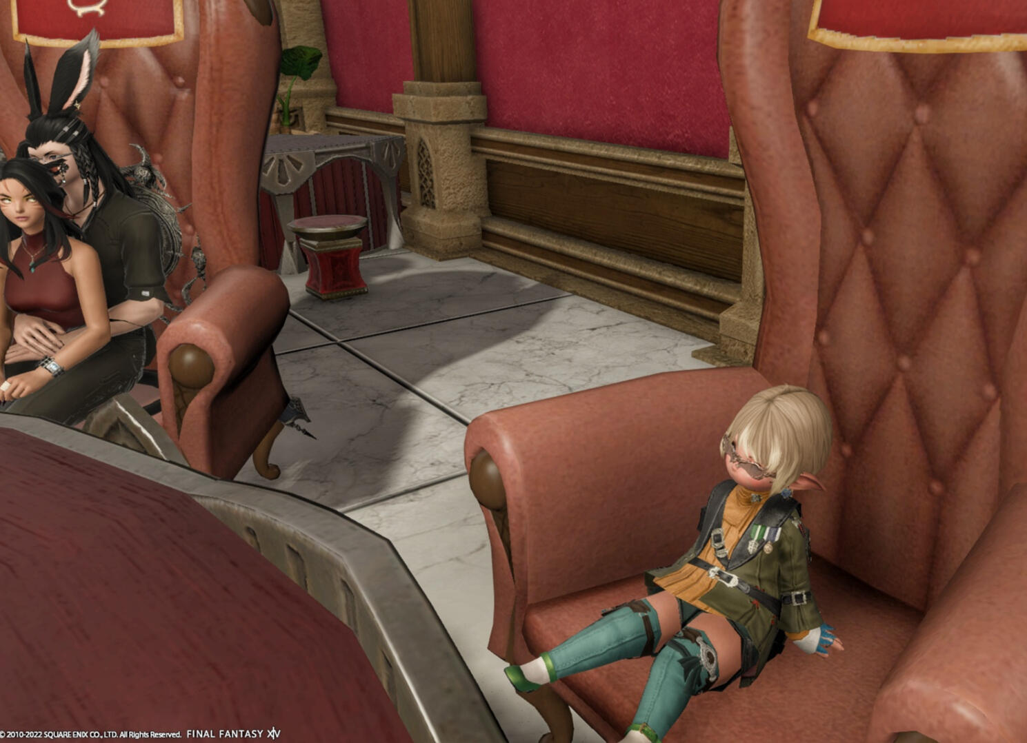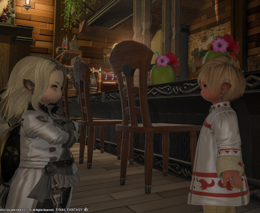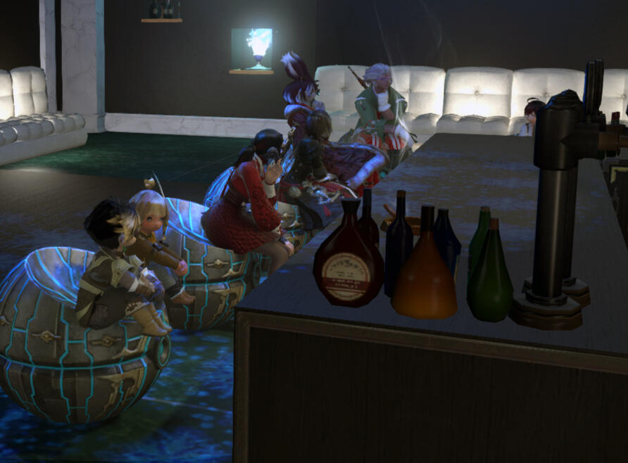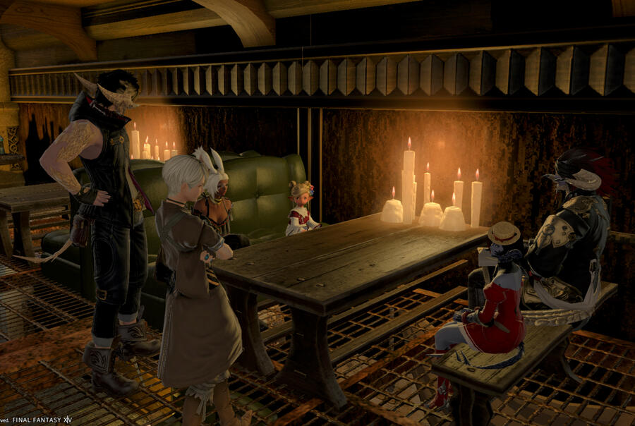Oh my. I have never seen the Embassy so full, and there were times were downstairs in the Factory was literally shoulder to shoulder.It was wonderful!But, it was so very busy at times! Once, nine people walked into the lobby. Nine! I did my best to greet each with the same excited energy and respect, and beckoned them downstairs. I'm sure Genbu was just as busy tending bar. Ayama and Altanai must be exhausted from dancing. I wonder if Kasen still has any voice left? And Tsukiko and Karaku must be tired from standing and tending the aethertenna all night. They must needs a chair up there. Vida did a wonderful job, I'm told, of making sure everyone remained in line. I know I'm wiped.But it was so worth it! Early in the evening, an armored Lalafellen wandered in and removed his helmet. His hair - it...it...it remained perfectly formed into a beautiful pompadour. I just don't understand what magiks were used for such an illusion. Or mayhaps it was just very strong product of some sort. I kind of had the eye and a liking for this warrior and convinced Kasen to head downstairs and purchase a drink on my behalf. His name was Huckle Finn and well, our guide actually purchased two: one for our guest and one for me. Little did I know it was the super delicious and extra-strong alphi-nade! That alcohol hit fast!Eventually, Huck's friend showed up and they wandered down to the Factory. I set aside my girlish crush and tended to tidying up the lobby before more guests arrived.Pearl showed up. Sauntered in like a dark and beautiful aether cloud and drifted her way downstairs. That creature. Is. Something else!Eventually, Nyx and Huckle found their way back upstairs and I watched them step through our private chambers. I followed and found them in our workshop. It gave me great joy to sit at the wee Lalafellen-sized desk in the corner and get to know our guests more...but had to return to my duties. Soon, Nyx parted ways and left Huckle to wander the Embassy. I encouraged him to explore the steam room, - which he did! Said he'd highly recommend it to others and that it was incredibly relaxing! Even stated that mayhaps a portrait of his calming face (and glorious hair) be hung upon the brick walls to further add a calming effect. I would have to ask my employers and commission such a piece. He soon took his leave, but not before I learned he's descended from generations of popoto farmers!!!!!All night was a never-ending torrent of guests. It was incredible!At one point, a Lalafell joined me upstairs, needed a break from the loud music (which we could still hear through the floorboards), and needed to rest their feet. So, they took their leave to our washroom, changed their clothes into a stylish suit, and joined me on the couch for conversation. It must have been hours, but the time flew so quickly. We were constantly interrupted by the stream of newcomers that needed to be greeted, but I got to know my guest as Tohen. A Lala with a regretful past (which is not my story to tell), we sort of bonded over long conversation. At one point, they wanted tea before pursuing a tale of their favorite place to travel. Genbu allowed us access to his chambers, where a steaming pot of tea awaited. As did the tale of the Sea of Clouds.Tohen admitted the Sea had some of the best sunrises they'd ever seen. It sounds amazing!! We're making plans to one day catch one there together! And, if for some reason we cannot: they drew me a map!Oh, and to help ease their heart and soul of past regrets, I gave them one of my empty journals as a gift. A token of good will and friendship. I daresay Tohen may be back. And oddly enough, they bequeathed me the journal should they pass on before I. Tohen did say they were in their 40s...so, more than likely true. But, I do hope they have a long, full, and peaceful life before.Soon they'll travel to the Far East, which brought up the Ruby Sea and my time with the Au Ra and the blessing of the kojin! But, regrettably, I took my leave for bed as the Factory was still playin' music and full of guests. Tohen gave me their card, should I (or the Embassy) ever be of need. I offered the same verbal courtesy.Huckle Finn promised to return, too.And hopefully Pearl.I'm certain we made several new friends this evening.It. Was. Incredible.
