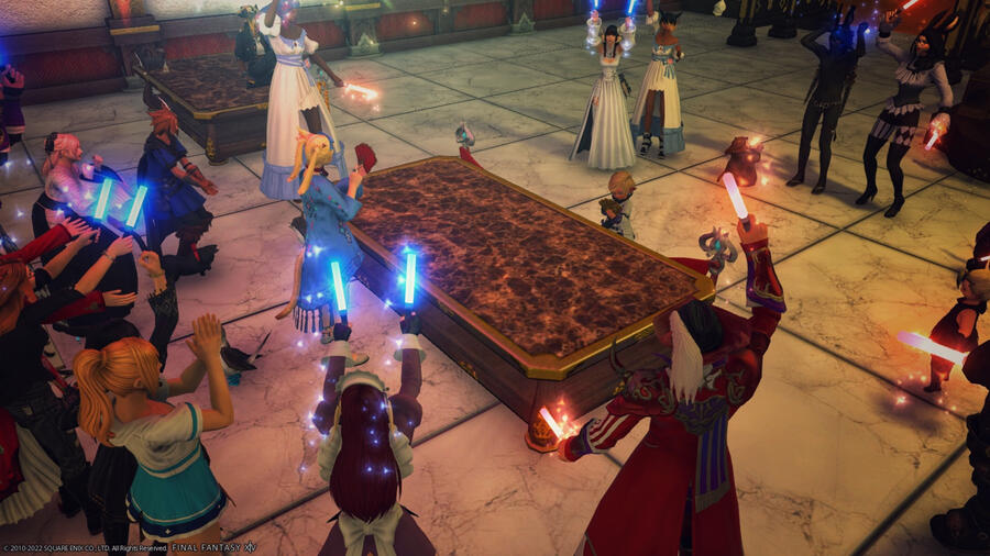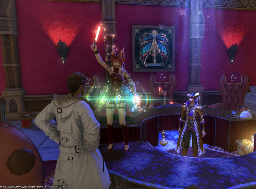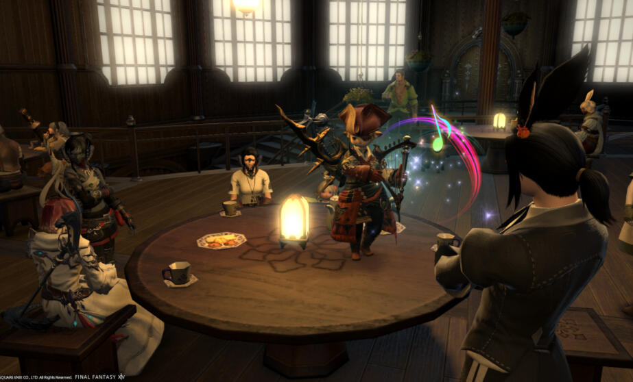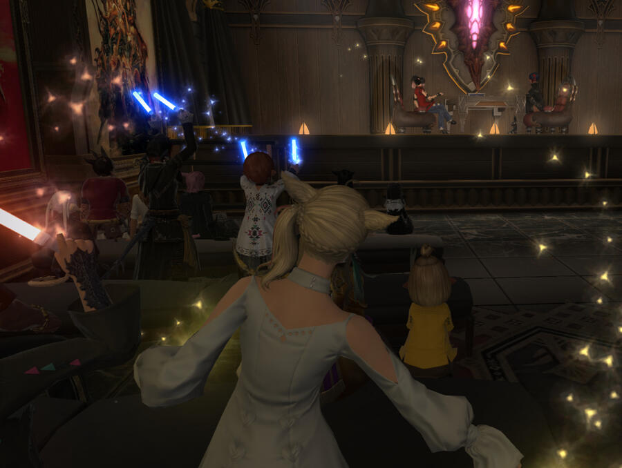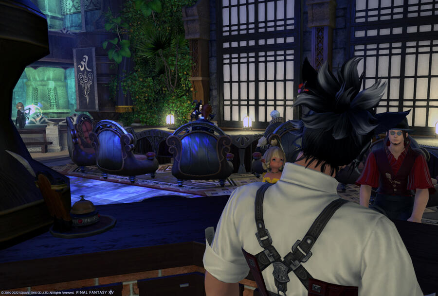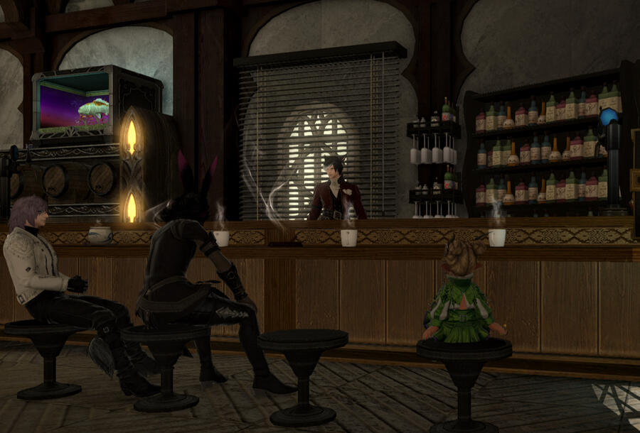 Oh my. I have never seen the Embassy so full, and there were times were downstairs in the Factory was literally shoulder to shoulder.It was wonderful!But, it was so very busy at times! Once, nine people walked into the lobby. Nine! I did my best to greet each with the same excited energy and respect, and beckoned them downstairs. I'm sure Genbu was just as busy tending bar. Ayama and Altanai must be exhausted from dancing. I wonder if Kasen still has any voice left? And Tsukiko and Karaku must be tired from standing and tending the aethertenna all night. They must needs a chair up there. Vida did a wonderful job, I'm told, of making sure everyone remained in line. I know I'm wiped.But it was so worth it! Early in the evening, an armored Lalafellen wandered in and removed his helmet. His hair - it...it...it remained perfectly formed into a beautiful pompadour. I just don't understand what magiks were used for such an illusion. Or mayhaps it was just very strong product of some sort. I kind of had the eye and a liking for this warrior and convinced Kasen to head downstairs and purchase a drink on my behalf. His name was Huckle Finn and well, our guide actually purchased two: one for our guest and one for me. Little did I know it was the super delicious and extra-strong alphi-nade! That alcohol hit fast!Eventually, Huck's friend showed up and they wandered down to the Factory. I set aside my girlish crush and tended to tidying up the lobby before more guests arrived.Pearl showed up. Sauntered in like a dark and beautiful aether cloud and drifted her way downstairs. That creature. Is. Something else!Eventually, Nyx and Huckle found their way back upstairs and I watched them step through our private chambers. I followed and found them in our workshop. It gave me great joy to sit at the wee Lalafellen-sized desk in the corner and get to know our guests more...but had to return to my duties. Soon, Nyx parted ways and left Huckle to wander the Embassy. I encouraged him to explore the steam room, - which he did! Said he'd highly recommend it to others and that it was incredibly relaxing! Even stated that mayhaps a portrait of his calming face (and glorious hair) be hung upon the brick walls to further add a calming effect. I would have to ask my employers and commission such a piece. He soon took his leave, but not before I learned he's descended from generations of popoto farmers!!!!!All night was a never-ending torrent of guests. It was incredible!At one point, a Lalafell joined me upstairs, needed a break from the loud music (which we could still hear through the floorboards), and needed to rest their feet. So, they took their leave to our washroom, changed their clothes into a stylish suit, and joined me on the couch for conversation. It must have been hours, but the time flew so quickly. We were constantly interrupted by the stream of newcomers that needed to be greeted, but I got to know my guest as Tohen. A Lala with a regretful past (which is not my story to tell), we sort of bonded over long conversation. At one point, they wanted tea before pursuing a tale of their favorite place to travel. Genbu allowed us access to his chambers, where a steaming pot of tea awaited. As did the tale of the Sea of Clouds.Tohen admitted the Sea had some of the best sunrises they'd ever seen. It sounds amazing!! We're making plans to one day catch one there together! And, if for some reason we cannot: they drew me a map!Oh, and to help ease their heart and soul of past regrets, I gave them one of my empty journals as a gift. A token of good will and friendship. I daresay Tohen may be back. And oddly enough, they bequeathed me the journal should they pass on before I. Tohen did say they were in their 40s...so, more than likely true. But, I do hope they have a long, full, and peaceful life before.Soon they'll travel to the Far East, which brought up the Ruby Sea and my time with the Au Ra and the blessing of the kojin! But, regrettably, I took my leave for bed as the Factory was still playin' music and full of guests. Tohen gave me their card, should I (or the Embassy) ever be of need. I offered the same verbal courtesy.Huckle Finn promised to return, too.And hopefully Pearl.I'm certain we made several new friends this evening.It. Was. Incredible.