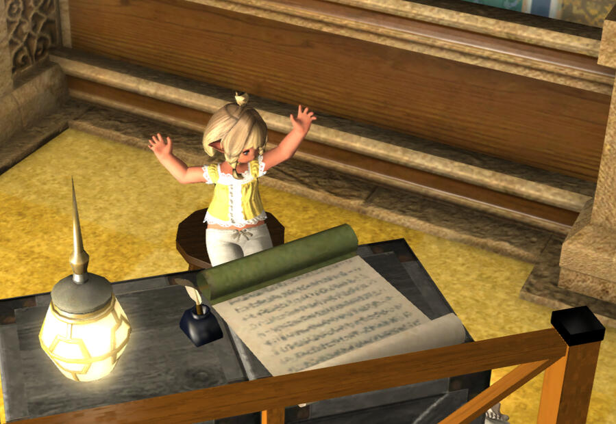 Based off of the tomestone notes I took while observing behaviors in today's reception hall, I need to preserve these thoughts in my journal. First impressions are oh so important.Today the Embassy was interviewing several adventurers, scholars, and travelers to fill much needed vacancies to handle various tasks. And, speaking of first impressions, I welcomed everyone to the Embassy of the Red Popoto. Ugh. What was I thinking? Immediately had to correct myself: the Embassy of the Ruby Princess.An elder Lalafellan, Opahoche, was interviewed and hired as a...what was the word? Bookkeeper? One who manages paperwork? Something like that. He was very knowledgeable. And is also from Ul'Dah! Ah, a fellow desert dweller from my hometown. I didn't know him from before today, though. Well-versed in the ways of etiquette and he also believes as I do: rules are in place for a reason and should be followed. We've already bonded over books and our beautiful desert. And he even knows a little botany on the side. Oh, popotoes are in our future. He made several trips in and out of the Embassy carrying stacks of tomes and scrolls. He denied any offer of help, but there were oh so many glorious books.Then there was H'yon. I still cannot pronounce his name as he does as I lack the appropriate accent, inflection, and understanding of his dialect. But, he's a Miqo'te adventurer with glorious black, fuzzy ears. He told us he used to be a pirate! But not anymore. He said he applied for the job because he's searching for some friends he believes may be located beneath the Ruby Sea. He's not sure he was hired, though (and I was not asked to issue him a linkshell). His blade nearly damaged our couch a few times. I don't think he noticed. Or cared. But he did let us know that he has been experienced in combat for a very long time. He's in his 30s, or so he said.A gray-haired Hyur arrived in dark armor. He looked to be about 20 and agreed with Opahoche's estimation. But...we could tell he was lying. I mean, who would lie about their age to a group of strangers that he just met? For what purpose? Trivial. He called it a "white lie" but a lie is a lie is a lie...He's really in his 30s. Anyway, he and H'yon talked about their fighting experiences and both seem to have been fighting for the same amount of time. I am kind of upset that the Embassy hired him. I can't trust him. Won't trust him. What if he's he's the man I was warned about in my tarot reading? A guide. Already a known liar. He's going to have to prove himself to earn my trust...and respect. Kasen is his name, if I choose to believe even that's the truth.The Embassy hired a very tall sea captain, Vida. She's soft-spoken and prefers the speech inflections of one familiar with the sea. But she's going to be piloting an airship, although she says she's had some experience with those as well. H'yon and I expressed a deep displeasure of deep water, especially the ocean. I was excited when I got to hand her a linkshell. Welcome aboard, Vida - haha - I wrote that in my best sea-farin' voice. I did misunderstand a conversation earlier where I thought she and Kasen were conspiring to melt down our golden dragons. But they made it clear that truly was not her intention. I updated my tomestone notes appropriately.H'yon and Opahoche got into a somewhat heated - well, may be not heated - just very loud discussion about diplomacy and war. I had to ask them to keep their voices down.So, there's now a well-versed scholar, a sea-captain who didn't seem opposed to piracy, a combat-trained Hyur who lies, and (possibly) a thick-accented Miqo'te who is most certainly an ex-pirate added to our staff. Three of the four seemed alright with bending rules or just creating their own. I don't know how I feel about that. Again, these people will have to prove themselves worthy of my employers.