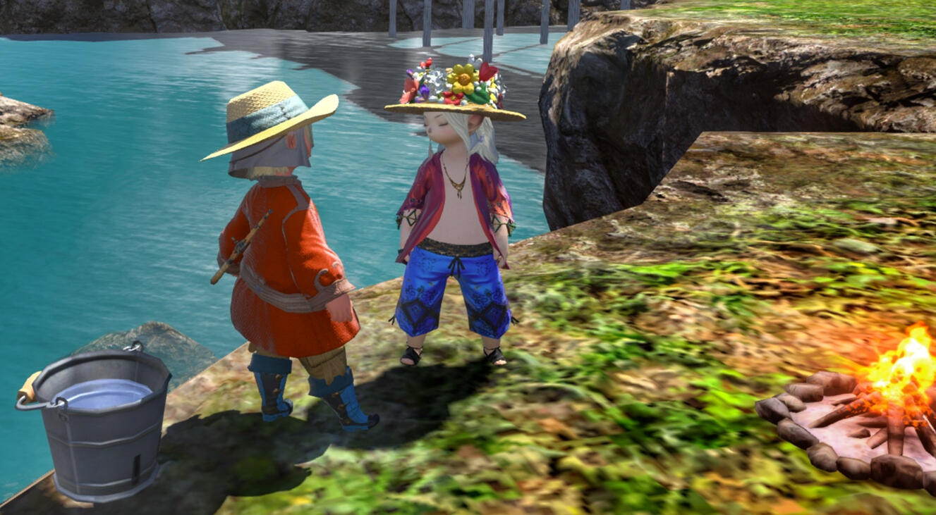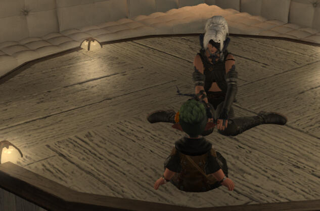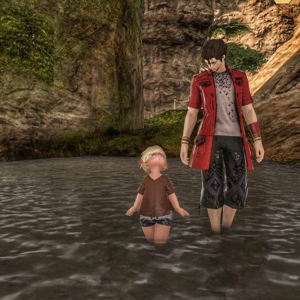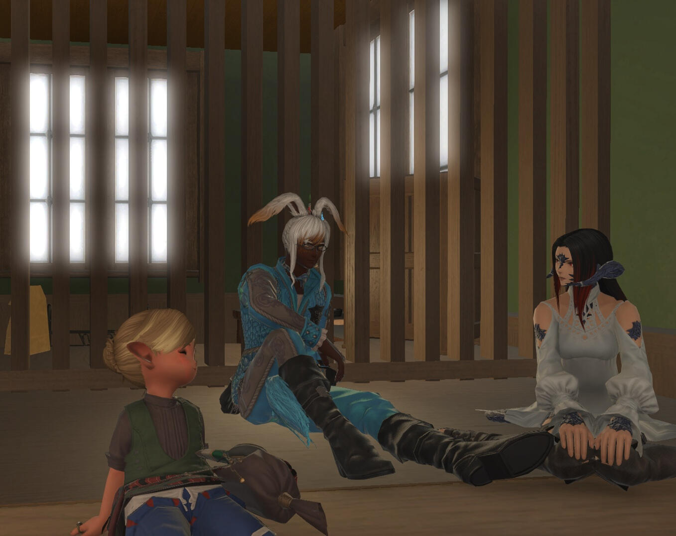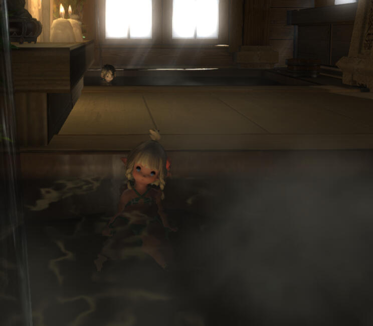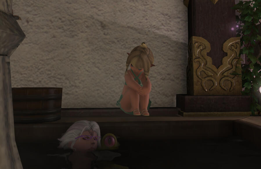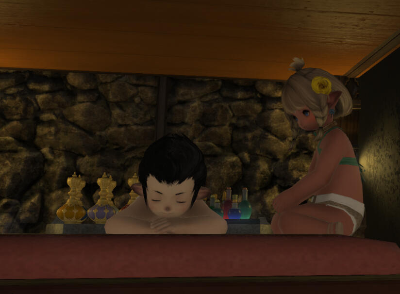 I've never had a massage before the other day.Solemn and I were perusing the ads in the Herald and found one for The Esuna Wellness Center. It talked about healing bath waters and professional massages.And no funny business!We arrived a little late since the proprietress already had customers lined up. But were invited to change into our swimsuits and enjoy the baths downstairs. Which, of course, we did. Oh, the things you learn about your friends while turning into prunes beneath warm waters.Did you know that Solemn had jet black hair in her youth? But it turned its signature silver hue in her 30s. To sport such beautiful hair for so long must feel a privilege. I know many a folk who pay good gil to have their hair match Solemns.Anyroad, we had guests in the nearby bath: a Viera and Hyur. They seemed rather cozy, chatting in whispers and nudges. Until the Hyur was whisked away upstairs for her massage.Bored of watching Nugget splash around in our pool, I sent a splash to our neighbor. Which set Solemn in a, well, solemn mood. So, groveling commenced and all was forgiven, and he even slipped into our bath to carry on conversation.Turns out his name's Mango. And it was his Nameday...which, of course, encouraged far more splashing.After a while Hana, the proprietress, came back downstairs with the woman in tow and escorted the Nameday Boy, Mango, upstairs. Turns out the Hyur was named Angel - well, it was more syllables than that, but she said we can just call her Angel.In walked an au'ra with hair as silver as my friend's and I watched Solemn hold his gaze as he slipped into the water. They babbled on about fighting for a while, I interjected a smidge about gardenin'. And soon Solemn was led upstairs.Mango literally melted into the floorboards, which occupied Angel in doting concern. So, the au'ra and I began talking. His name's Diamonte and although he favors fighting over all else, he made mention of Fates.So, I asked if he read palms. His answer was...vague...to say the least. But offered to read mine!