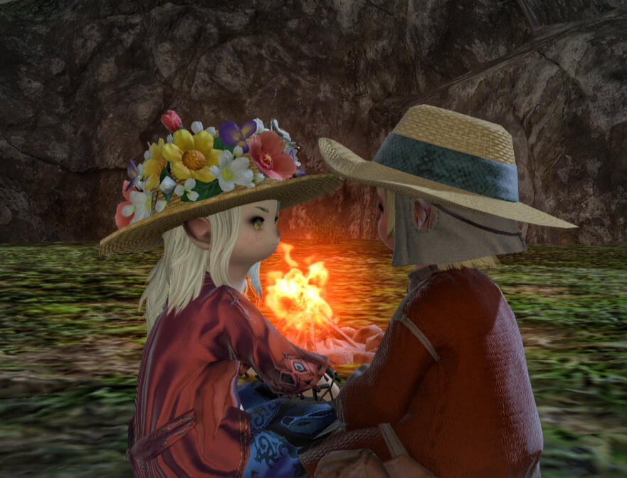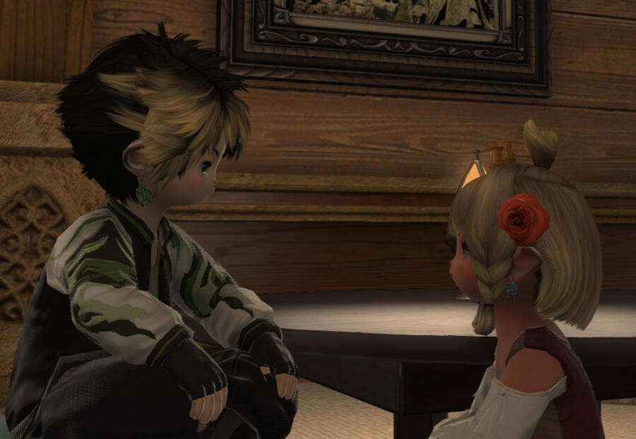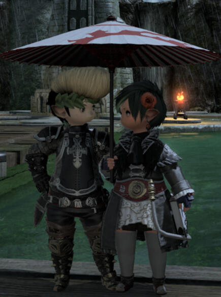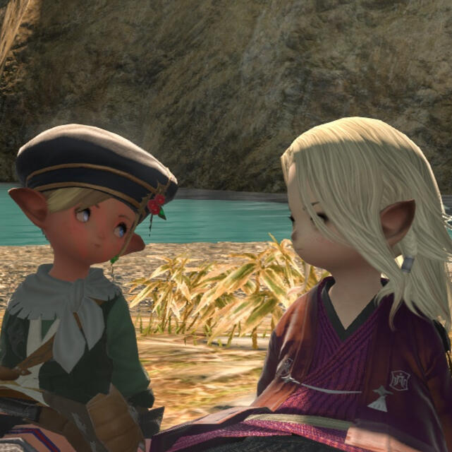 I've been putting off writing this entry for several suns.Huck and I met for breakfast at Gridania's inn. True to his word, he wore quite the ridiculous outfit: a pukey-shade of green shirt (which I actually really want) and a goblin mask! Big ol' ears and all! Ha. It was a sight to behold. I had secretly let Cherry know where we were meeting and she beat me to it! I found the two of them already sitting at the table. If memory serves, he ordered the Wailer's Morning breakfast and Cherry - well, Thall's Balls! - I can't remember what she ordered.I brought the steaming plates and Huck shoveled some of his impossibly-large portion onto my plate, too. How very kind of him. We also started off with some mornin' ale, although Cherry opted for a tea or something. I know I had some nerves for the day's adventures; mayhaps Huck did, too? The ale may have helped soothe my nerves...just an ilm.Anyroad, I spied my masked friend try to shovel eggs into his mouth - while still wearing the goblin mask. I couldn't help but laugh as he sheepishly removed it and ate more delicately. As I once tried to describe to him, I shoveled my breakfast into my mouth as fast as I could (imagine if you will a smallshell devouring whatever it is they eat so greedily). Growing up with my brother, sister, an adopted siblings: if you didn't eat fast, you didn't eat at all - it had already all been claimed!Huck spoke with Cherry awhile about Nyx and the night they shared. It was glorious to see her blush. Mayhaps more than friendship blossomed betwixt the two book lovers! We also talked about Huck's skincare cream, which sent him off and away in a hurry so he could further tweak his formula.Cherry and I talked for a while longer, as I confided my jitters and fondness of Huck. She said it wasn't that hidden...oh gods, I wonder if he knows? Before long, I took my leave as well to begin the journey to our portrait sitting.Camp Bronze Lake was the agreed-upon location with Sani, the artist I was telling you about earlier. It was raining. Pouring, actually. But you could still make out the backdrop of the waterfall through the falling drops. Huck and I arrived, but she was nowhere to be found. Rather then wait, he scrambled off to some errands while I waited. Eventually, she arrived, uttering apologies for having overslept. I pinged Huck on his link pearl, and he let me know he was on his way back.This gave Sani and I a chance to talk about the piece. I let her know Huck's grand idea for something that would calm our guests, which of course included his face. Ayame had suggested I, too, wiggle into the sitting, to which Sani agreed. Huck and I had discussed it over breakfast. It was bound to happen as Sani had no objection!Huck arrived and it was still raining, so I stepped over to shield his pompadour from the assaulting water pouring from the sky. It was awkwardly close. And I do believe I blushed. Or mayhaps it was the chill in the air dancing across my cheeks?Sani found the perfect location that both kept us out of the rain (although she stood fully in it the entire time!) and showed the beautiful falls behind us. She left the decision of our pose up to us! After much debate and indecision, she suggested Huck sort of kneel in the flowerbed and I sit, laying my head upon his shoulder. Two Lalafell, surrounded by blooms, serving as the foreground to the majestic falls of Camp Bronze Lake. Sani was certain it would cast a calming presence in our Embassy's steam room.Amazingly, the canvas and her paints were not blemished by the falling rain. Her partner, Shade (I think his name was...) had treated her tools o'her trade in some alchemical manner as to protect it all. There she stood, an Au Ra beautifully attired in a golden yellow dress and pale blue sleeves (which matched her facial tattoos). Her eyes, though, I'll never forget: pupiless. Unnerving. And yet, as she appeared blind to me, she obviously wasn't. She was able to observe Huck and I, greet us directly, and paint - by the gods, did she paint! Fluid, dance-like movements - at times she hummed in the rain - she'd peer from behind the canvas, analyze some angle, then get right back to painting. It was neat to watch!And, oh, being so near to Huck...stationary, unable to move, my face resting on his armored shoulder - I mean, I won't lie: it was uncomfortable. His armor was hard. But his body temperature seeped through. But, oh it was so wonderful. At times, he'd shift his weight and I'd shift with it. Trying to keep the original pose. A sort of shifting, sitting, warming dance. Rain? What rain? Cold? Never - I was flush with warmth. I mean, I was so close I could smell his skincare oil mere ilms from my nostrils. I pray Sani did not capture my ongoing blush in the portrait...She began to speak of her partner, Shade. And the tone of love she emitted was inspiring. I bet it could end wars, soothe angry beasts, and charm all of Eorzea. I commented how obvious it was that they were in love, and Huck shot some snide remark that I should never be that...I think he said soft. Or was it smitten? Holy popotoes!!! But - but - Did he know?! I was grateful he couldn't see my expression, but Sani stepped up to my defense and said I was, "...as hard as the stones I pluck from my garden." I do believe she smiled slyly my way. That quickly shifted the conversation to my throwing arm and the pebbles I hurl at rats. Whew...Eventually, she announced she had finished! Just as the rain ceased. By the gods - did she wield control over the weather? We both stretched the kinks out of our stiff muscles and ran over to look. It was spectacular!!! She gave strict orders to store the canvas in a room that wasn't the steam room just for one sun as it cured. Then we could frame and hang it up in it's intended destination!I had forgotten that Sani said she also reads runes! And Huck and I took her up on the offer to have our fortunes told. But, alas, dear Journal, my hand tires from all of this writin