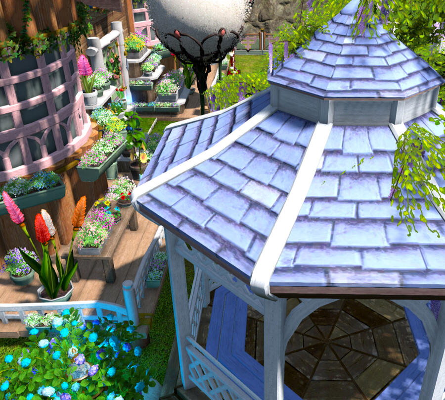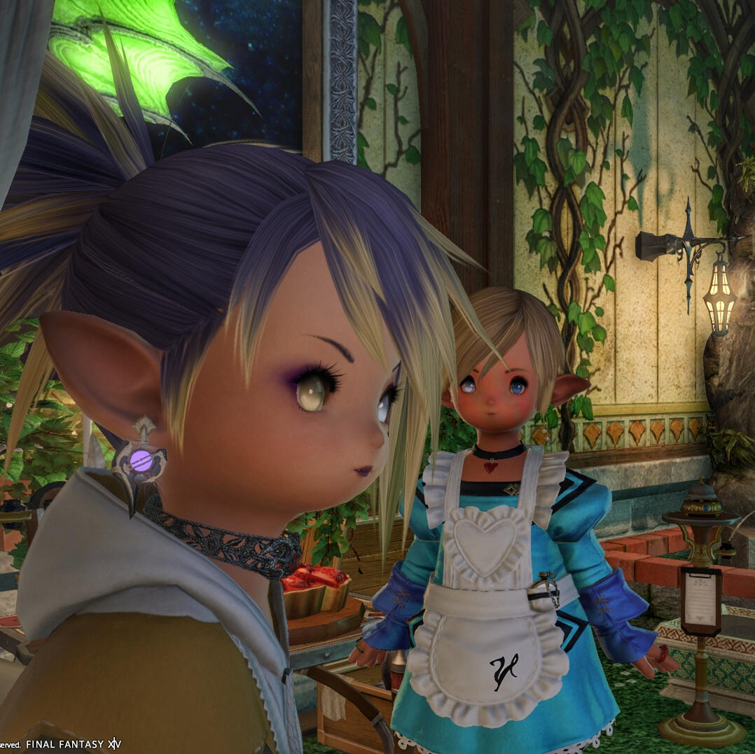 I sat alone at a gorgeous wee tea-table outside and was joined by the most pleasant Viera, named Julianna. After we spoke for a bit, I learned she was to be sent off to the highest bidder. The waiter soothed my fears of sex trafficking, but instead this was a consensual auction among patrons. Julianna was a volunteer. And offered a casual date to the highest bidder.All the staff were to be up for auction that eve! The minimum bid? 100,000 gil. Ouch.But, to draw in the crowd and prospective bidders, hence the free food and beverage.Julianna ordered for us: Zodiark's Embrace (a strong wine made of purple carrots) and Cubus.Our Miqo'te waiter (who would also be up for auction later) explained it's a fancy name for a fig-covered cheesecake. Then later went into great detail of the origins of the name: after some long ago ancient slime. Speaking of which: I devoured my Cubus in my usual face-shoveling fashion and E'met (the waiter) summoned a wee cubus slime o'his own to vacuum up the cheesecake crumbs on the ground. It was glorious!Just as I was to take my leave before I fell prey to a cheesecake-induced nap, E'met mentioned there are aether readings held at their venue.Now, I've had tarot, rune, palm, and tea leaf readings; but NEVER an aether reading.He pointed me to another nearby table, also occupied by a Viera and a Miqo'te. The Viera's name was Emet' - all very confusing and far too similar for my tastes. Emet' explained that aether readings are a very time-consuming and private affair - and rather than assess something as simple as what the Fates have in store for your love life or future ventures - they -They read the aether and divine the future of your health and make nutritional suggestions to ease the journey.Amazing! I'd never heard such a thing! It will take nearly all of my gil, but I shall be in contact with E'met (the original waiter) to schedule a time and place for my aether reading.Things got busy at the hostelry very quickly. Emet' had to leave to greet guests and the Miqo'te at the table, Baj'a, was drafted into service.I wished Julianna all the luck and head out before, I too, was asked to help serve. And far too many Emets: E'met and Emet' for my wits.