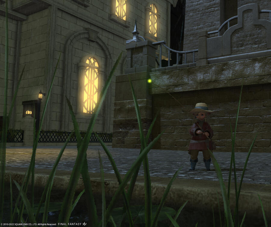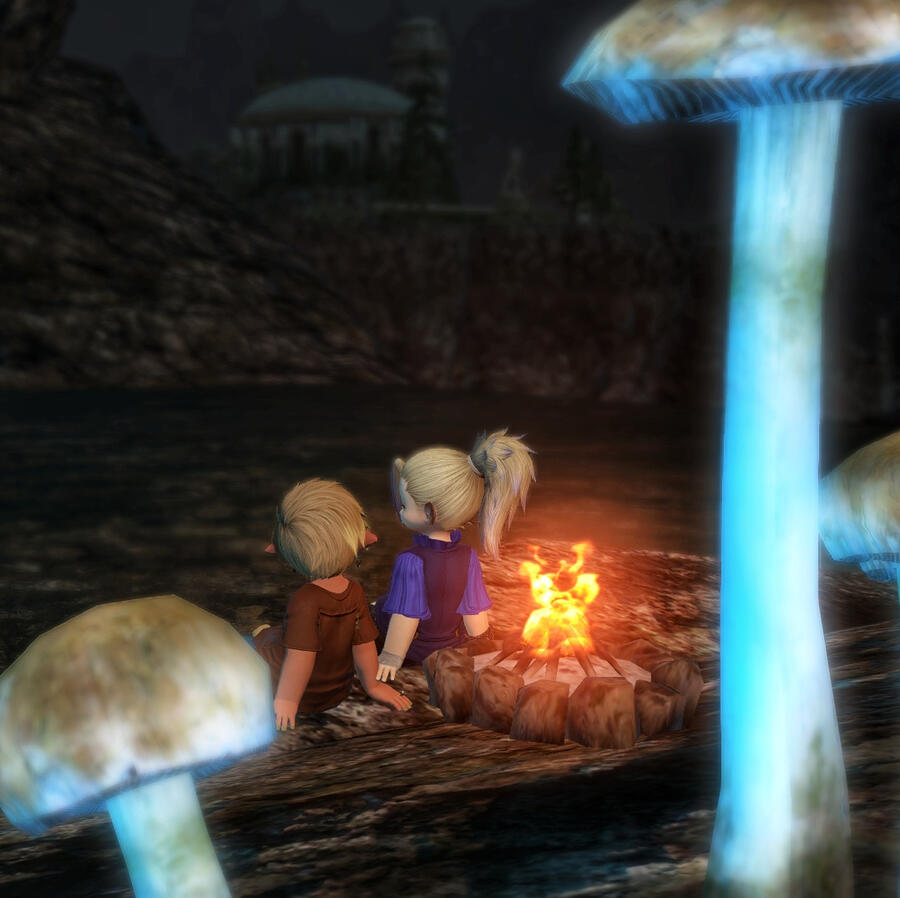 What? Today on our trek to Limsa Lominsa we ran across some rats with glowy blue eyes. Vida and H'Yon made short work of them and I even successfully threw a pebble and killed one! But, beneath the bridge we found these barrels in the river. One was leaking and it was glowy blue liquid. I really wanted to take some with us, but 1) I didn't have a jar and 2) Karaku said no. So, we went on our merry way.We were walking at night, and although the moon was full, I almost got pummeled by a charging chocobo. I barely stepped out of the way. Terrifying!!Kasen got us lost in Limsa, but we eventually found our way to the airship and across to Gridania.Before we got lodging for the night, Karaku almost fell into the lake trying to snag a firefly. I was able to grab his coat hem and keep him from tumbling in. Li'l ol' me! I know it pales in comparison to his rescue of yours truly, but it did feel good.For the night, we shall sleep in the beautiful town of Gridania.