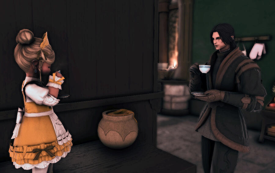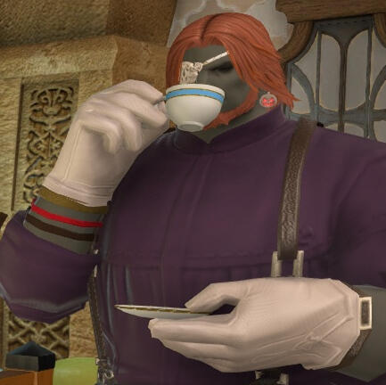 Last night I heard about a venue right here in Goblet, one of food, beverage, and fortune sayers; it was named Cup of Fortune! I went. OF COURSE I DID!It was a beautiful establishment with very soft, soothing music. I didn't order any food, but did order a mulled tea. All I could afford was either a bone reading or tea reading, so opted for one that I could also savor. And still handed over half the gil I had to my name. But for reassurances or a glimpse into what-could-be: worth every coin.The tea was delicious: blended spices and herbs rounded out it's deep amber hue. I took my sweet time sipping it, blowing the steam from atop the cup, wondering what the loose leaf would reveal at the bottom.Finally, the attendant walked up to me, smiled, and deemed I had enjoyed enough of the tea to allow him to connect with the Fates. I believe he said his name was Thomas — or Thomas-something...? He gently took the saucer and cup from me, flipped the cup upside down and allowed the excess tea to drain.His face became stoic as he flipped the cup right-side up and examined the mess o'leaves. I don't know how they divine anything from herbs and spices! But, I waited.Finally, his smile grew once more, he sat next to me at the counter and this is what he read:"Right! So first we've got a question mark - see here?" He pointed to a little blob that, yes, looked like a question mark. "Pretty straightforward, aye? You've got questions you want answers to. Probably feeling a mite frustrated, so proceed with care before you have all your answers."He continued, "Okay..." He scrutinized the cup a little further. "Hm, I think this next bit here is the mountain. That's usually about big ideas and hard work paying off. Gotta climb the mountain, but if you keep at it you'll get there."After pausing and squinting into the cup, he said, "And this last bit here — the circle, see?" He pointed. "Yeah. Honestly, this is one of the most straight forward readings — do your research and keep at it, work hard, and things'll come full circle and succeed — The circle meaning, literally, success and completion. so yeah, seems pretty optimistic."And that was it, dear Journal. Words I needed to hear. I know that today is a very important day with a lot of activity and excitement. I shall hold onto my reading. And heed the encouragement and instructions the Fates have provided.