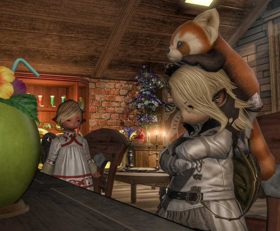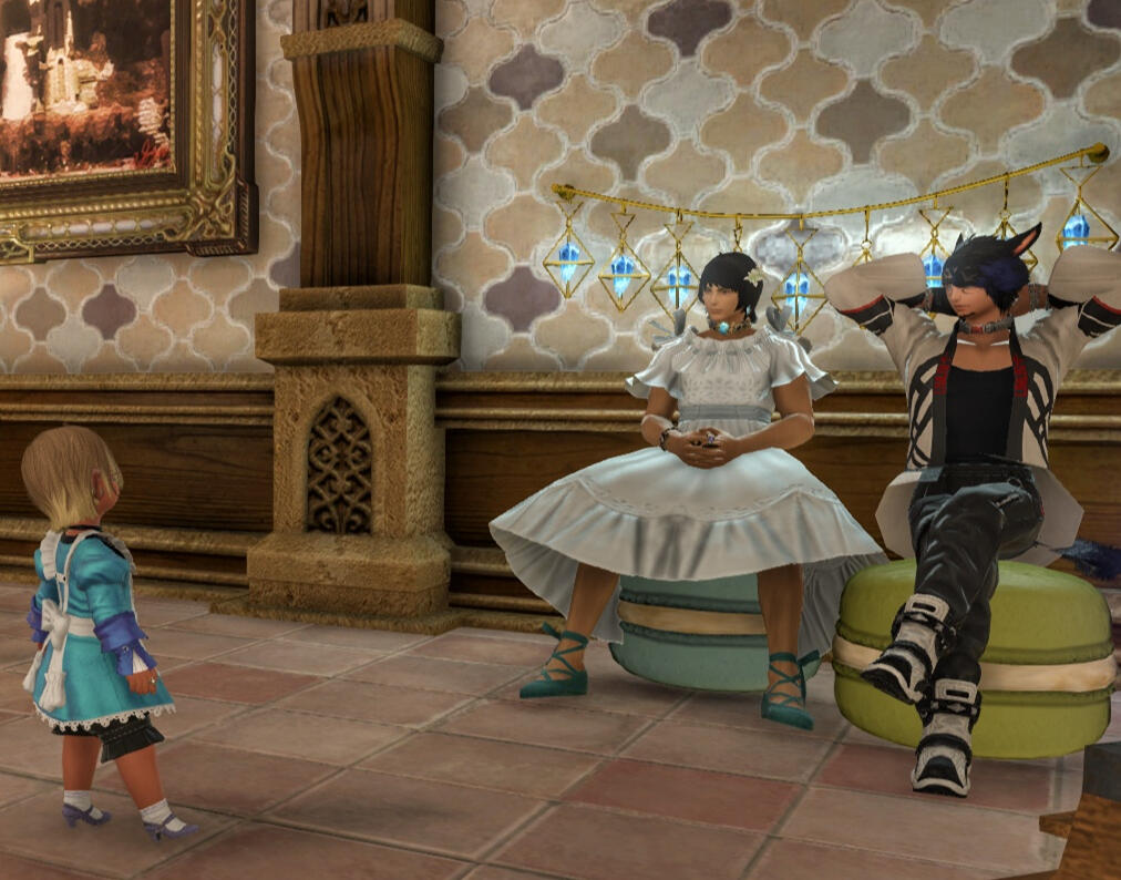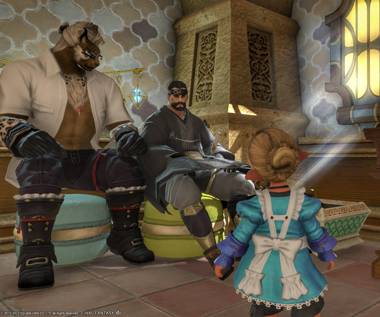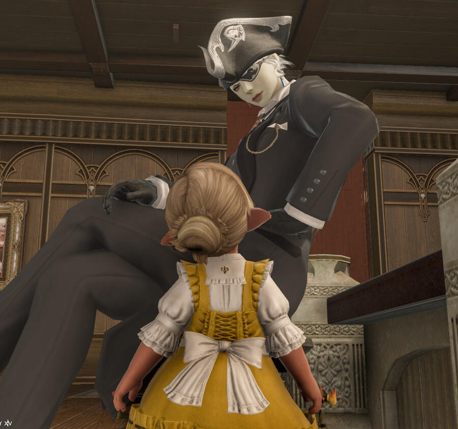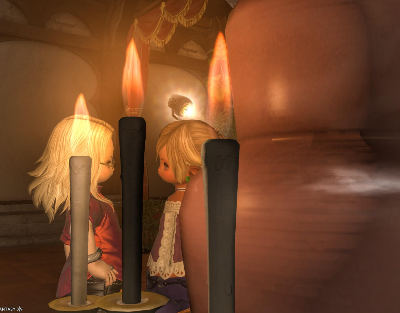 By the Gods, Ayame and Milleuda enticed so many guests to Factory! I'm so grateful Huckle Finn showed up because he was so very helpful in the lobby! There were times where I needed to excuse myself from my duties, and he was right there to entertain guests until I returned to be able to provide them the proper aethertenna frequency! Pray, he must needs apply for a job! I tried to encourage him, but he insists we would not be able to afford his wages. I must needs continue to insist!Cherry also showed up and we got to speak for a few moments. Constant interruptions of a steady stream of guests, though, does not make for good conversation.Luckily, she is patient.Oh man! A Lalafell walked into our lobby, she looked familiar, but I couldn't remember. She reintroduced herself as Jyx and offered me a gift: 50 popotoes! Fifty! She smiled and remembered how much I do love them. That was so very kind of her! My heart swelled up like a gigantic popoto, bursting with joy. I quickly stowed them inside the desk until I could retire to my room.Earlier in the day, I was traveling and swore I saw Genbu. Alas, it was not! But, it was another Au Ra that looked very similar. So, I asked if he knew Genbu...and he say "yes!" I invited him to join us that eve at Factory to reconnect and say hello. That night, he sent his sister ahead (I forget her name, but do recall it started with a "V")...and then HE showed up! Gorr. Gorr was his name, and he looked entirely different dressed for a night at Factory than when we met in Ul'dah. It turns out he knows another Genbu. Ha. Small world!At one point, Karaku summoned Nyx downstairs, so I escorted her (was she in trouble?) and I went back up to my duties and to keep Huckle company. He confided in me that he returned to his home and met with his family. His mother was so surprised he wasn't yet dead that she fainted! Ha! FAINTED! He insisted she was okay once she recovered, but he only stayed the day. I let him know he was oh so very lucky to still have his parents, and advised him both of mine passed when my siblings and I were very young. Family is so very important.Huckle invited a friend, a gigantic sort of man, I mean...he was massive! And his name was...um...something-Wall. How appropriate. Pray, how did he fit into the basement downstairs? Massive! Anyroad, he and Huckle eventually settled down to relax in the steam room while Nyx, Cherry, and I spoke on the couch.Milleuda. Oh, Milleuda. I met her briefly in Ul'dah before Factory opened to let her know that Ayame may be delayed for their intended tea date. And then she later showed at Factory as well. She is something else. Tall, elegant, kind, and she offered her assistance due to our lack of staff that evening. I will never understand how Ayame and Milleuda still had any voice left after the amount of shouting they had to do to advertise our event.At one point, Milleuda returned from wandering and fishing for guests and Huckle wagered a guess that her profession was assassin - or wait - "killer" was the word he used. She did have an air about her, and I hardly knew her...so I took a careful step behind this self-professed hero. I don't know what protected me more from her sight: his perfectly-coiffed pompadour or his broad shoulders. But, our tensions eased as Milleuda stated she is more of a chaplain. Much better than killer.As the bells droned on, I eventually couldn't keep my eyes open any longer. The constant stream of entering guests had dwindled down, so I excused myself from Cherry and Nyx's presence and entered the hall where the washroom, steam room, laundry, and my tiny bedroom reside. I loudly announced my presence in case Huckle and Mr. Wall had stripped down to their smallclothes or draped in towels - I was afraid the door may swing open at any moment. Luckily, they heard my call and exited the steam room fully clothed. In between apologetic yawns, I let them know I must retire for the eve, but not before Huckle asked me to settle a debate between he and Mr. Wall:"Just how did we afford such a luxurious house on an adventurer's salary?"I smiled and advised he must ask my employers that question; I was not privy to discuss such things.I fear there are so many details of the eve that I am forgetting...must be the Alphinade Huckle purchased for me. Goes straight to the head...Such a wonderful evening...WAIT...I forgot to retrieve the popotoes from the desk! I must needs make haste!