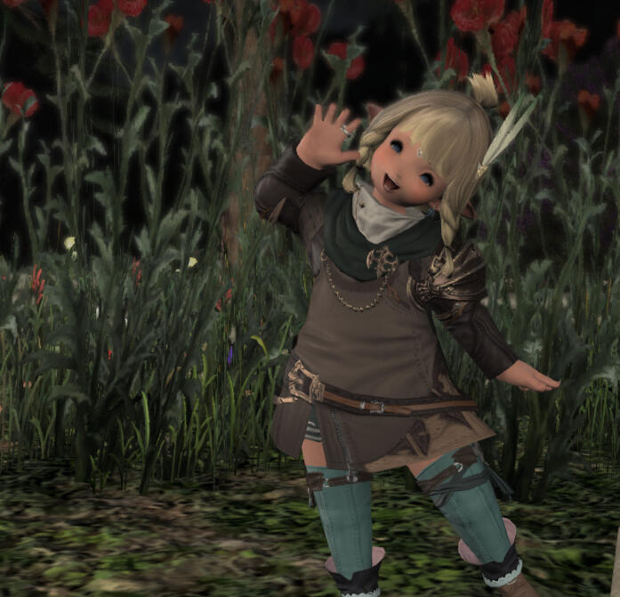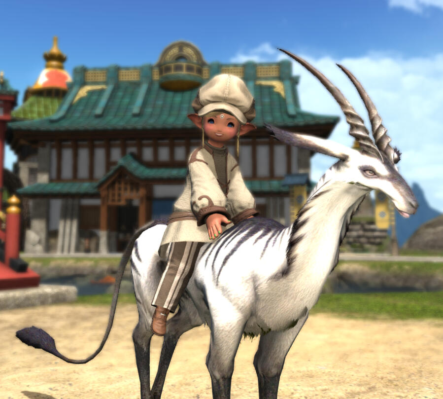 I received a ping on my ‘pearl that Zototo was in Idyllshire and wanted to meet. Luckily for him – or is it I – anyroad, I was ALREADY in Idyllshire delivering some items to a client. I meandered around my favorite spot (the fountain near the edge of town) before he let me know he was waiting at the aether plaza.I joined him there, and simply insisted that we return to the fountain since he’d never been. Much to my happiness, he obliged and it was a chase o’antelope and that same black chocobo to the long-forgotten corner of town.We took a moment to appreciate the view, not too long though as that bottomless drop is quite nauseating before retreating back to the safety and stability of the fountain’s edge.He let me know he asked me here to apologize for our last encounter having ruined my best (well, my only) dress. And that he had taken it upon himself to procure something in its stead, and something that may offer more protection! Something he’d even fancy wearin’ himself!He unfurled a beautiful piece adorned in various leathers, heavy cotton, and it even came with a beautiful deep green cape – one that nearly matched his own! It has a small spaulder on the shoulder to serve whatever purpose, but that’s the piece that gave me the most trouble. Eager to try it on, I insisted he turn around and keep watch. I had enough privacy in this far corner of Idyllshire to remove my tunic and fight my way into this – this – well, I suppose it IS armor? It’s like a shirt, but – more. Deep browns and greens – a tuft o’white assaults my chin from beneath the leather. The sleeves cover from the shoulder to the tip o’my wrist. Fully covered. And I daresay the cloak’s pin would serve as a weapon in a pinch!And, true to his word, he did not turn around. Well, I assume he didn’t – as my back also faced his. I announced I was once again decent, but that the piece felt tight, he helped poke and prod a few pieces better into place. I had no idea leather could be so stiff. It smells divine. Or is that Zototo?But, I love it! Oh so much! And cannot wait to resume our training!He wasn’t done…He surprised me! He said he had returned to Halatali and found my fallen Oldrose, and that it was yet still viable. He consulted with a friend versed in magick and they were able to propagate the oldrose! He gave me a planter box full of ‘em! Overflowing! Beautiful! Reds and deep pinks! Such a gesture! I’ve already had it hung o’er my bed so it’s the last thing I see when I close my eyes and the first I see when I wake.My errands could no longer wait, and as he had some mischievous glint in his eye and a smile upon his lips, I ran up, kissed his cheek, and mounted my farty stag: riding out of sight. The oldrose box was firmly lashed to ol’ Farty’s backside.I have since been able to stitch on a patch o’the Three Sisters Trading Company and will naught wear anything else while out and about on errands. Or training. I know another day is upon us soon. But when, dear Journal? When? Sometimes…sometimes I even sleep in it…