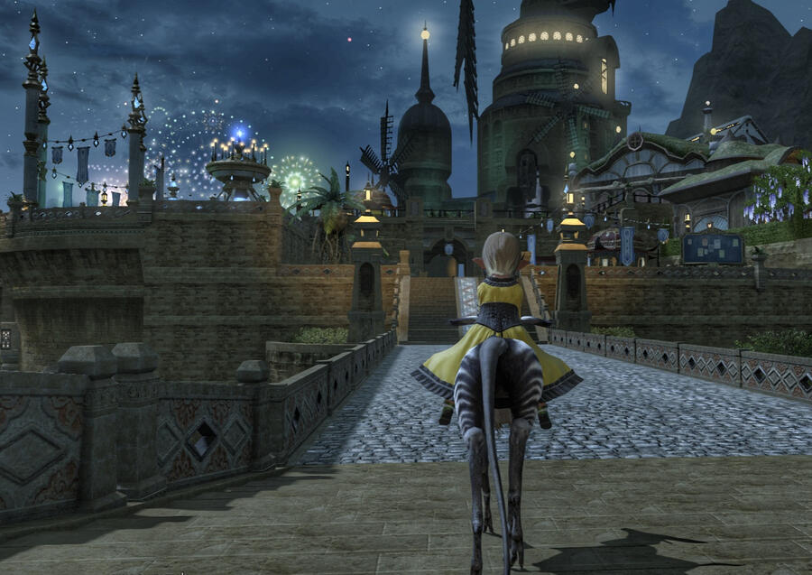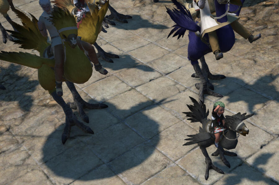I'm happy to say: I beat them all! None were able to get to that last shot of alcohol! Arnaud was the first to fall, immediately followed by Altanai. And then G'erran. Like dominoes...But they all did make it through several shots.One sun I'll be back. And I'll slam my pouch o'gil on the counter. And slam those shots so fast I won't taste 'em - and I'll get on the damned Wall!I vaguely remember telling Nyx that I liked Zototo - and she mumbled "Who didn't?" Ha. So I feel less embarrassed about my slurred confession. And she said he had a figurine commissioned? Of himself? A tiny Zototo doll? Nay - I misunderstood. Something to do with Triple Triad. But now - I wonder if I can find a carpenter to carve a wee Zototo-doll? Is that weird? That's weird...Anyroad, Altanai insisted we go to the bath house. Arnaud and G'erran were too prudish and opted to stay and gamble. But Nyx joined us - even if she didn't get into the water.I tried to pry about she and Xaya, but she would hear none of it. Threatened to kick me, if my blurred memory serves. Despite such harshness, she's a big softy: she offered to carry me home since I was a wee bit too inebriated to walk safely to my apartment.So, Chocobo Nyx did just that: I hopped onto her back and rode her all the way to my apartment!Chaaaaaaarge!Although, I dare not speak of it to her, nor anyone, dearest Journal.And with that: I shall nurse this hangover with a bit o'tea and sticky rice balls.