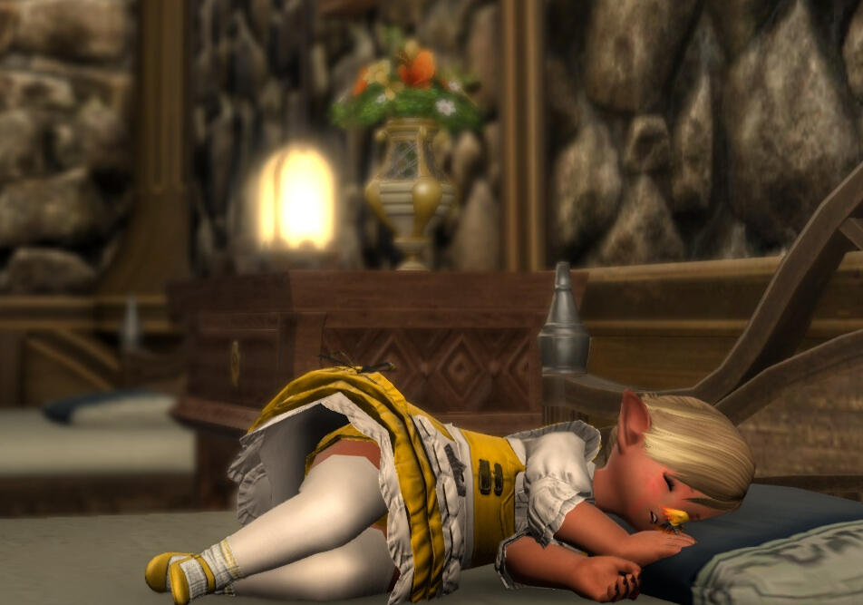 Dear Journal, After Red gave me a piggyback ride home from the Death Dice tournament, I hailed Badge on his linkpearl. He was still awake and at his home in Ishgard. I blurted out that he made a far better Dawnstar than Tori…but he’s to never tell her I said that! The desert night was cold this eve and I needed some…warmth. So I headed to the Ul’dahn plaza and rode the aetherstream to Bumpkin...