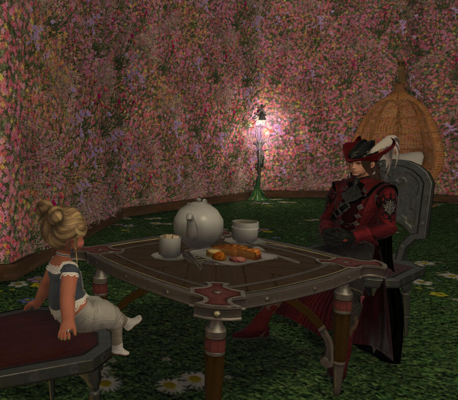 So much has occurred, Journal, in the recent past and I have been sorely lacking in my writing!Let's see. First off, I've realized I never fully explained: Huckle Finn legally changed HIS name back to his original name as well! So, if you see reference to Zototo Finoto in these pages, it's that same Lalafell I fell smitten with that first night at Factory.Speaking of him, oh my - we went to the House of Virtue casino one eve and found ourselves in the bath house (did you know it's free?) - I found a swimsuit in the changing room but he - he - HE wore his smallclothes!Do you know what happens to white small clothes when they're wet? Well, let me tell you: as a professional laundress, I DO. So, I sat in the bath across the aisle, daring not to turn to address him until he remained beneath the water.Although, what one can imagine beneath the steaming waters is another thing.Nyx and Xaya showed up later and shared a bath - when I say bath, they're like small pools. Nothing small and intimate. Anyroad, they seemed to be enjoying the conversation.I don't remember the name of the drink I had, but I think it may have been called the 24 Karat. It was sweet and expensive - precisely the reasons Zototo said he didn't enjoy it.Hm - what else?Oh! I returned another day solo to the House of Virtues; there were no chairs at the dice tables below so I was escorted upstairs to the VIP room! I was alone with the dealer for quite some time. Turns out, she runs the place! The proprietress was my dealer! Mayberry was her name. I lost almost all of my gil that night. And, I'm not supposed to tell anyone, but she gave me a free drink on the way out and pockets full of cookies.And then there was the rainy night in New Gridania...Zototo had asked me to join him for dinner at the Carline Canopy. Seeing as I had not yet purchased a new dress, a neighbor loaned me hers: a silky white number with puffy sleeves! I loved it. I even plucked off an oldrose from Zototo's planter above my bed and tucked it (securely this time) into my hair.By the time I passed through the aether and ended up in Gridania, the weather had shifted and it was pouring down rain. I hadn't thought to bring my parasol, so ran as fast my legs could carry me...but was a sopping mess by the time I arrived.There he was: already seated and dry in dark blue trousers, a red vest with white shirt, and of all things: eyeglasses. He later said they were a disguise - so just he and I could enjoy our dinner undisturbed from his numerous and adoring fans.Brilliant thought! And he ordered us beverages.Red wine warmed my veins and I forgot the cold, wet clinging silk of my dress.Just as the wine started flowing, a Lala neither of us knew joined our table. Always pleasant, Zototo made introductions and the strange fellow busted out a harp and played a tune before suddenly vanishing.In his stead, though, was Nyx! Magic? Or just perfect coincidence? Anyroad, she joined us as well and conversation continued. Zototo had previously mentioned an accident on a mission of he and Nyx. When I pressed her for more information, she said he had lost 100,000 gil worth of weapons?! WHAT!? Pray, it wasn't Three Sisters' artifacts; nor that such a mistake is ever made public.Speaking of the Three Sisters: nearly everyone showed up at our little dinner party! Xaya, Altanai, and even Mr. Wall! Even that little Lala-bard returned and continued to serenade us.Once he left, Zototo excused himself for a moment and returned in strange clothes carrying a variety of musical instruments. He stood atop our table and a few tunes as well!Free-flowing wine (I wonder who picked up the tab that night?) and Triple Triad games ensued. A drunk and dozing Miqo'te even sat on Altanai's lap and couldn't be persuaded to leave.Exhausted by the booze, I excused myself back into the night. At least by then it had stopped raining.I may have had a bit too much to drink that night as I can't remember the specifics of any conversations! Ha.