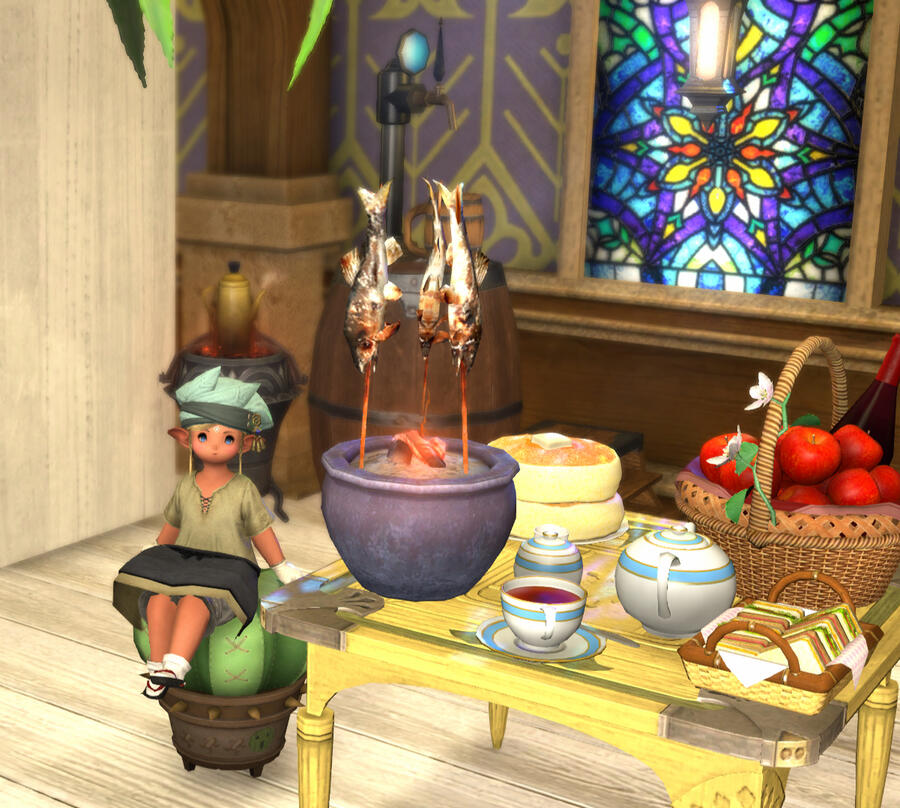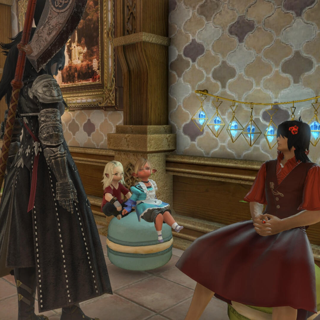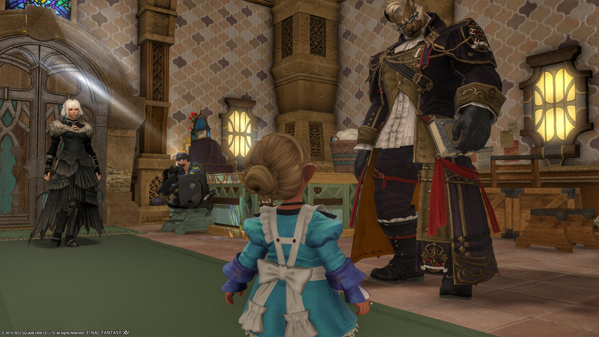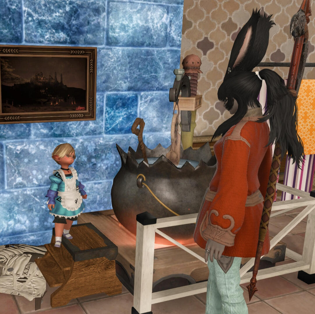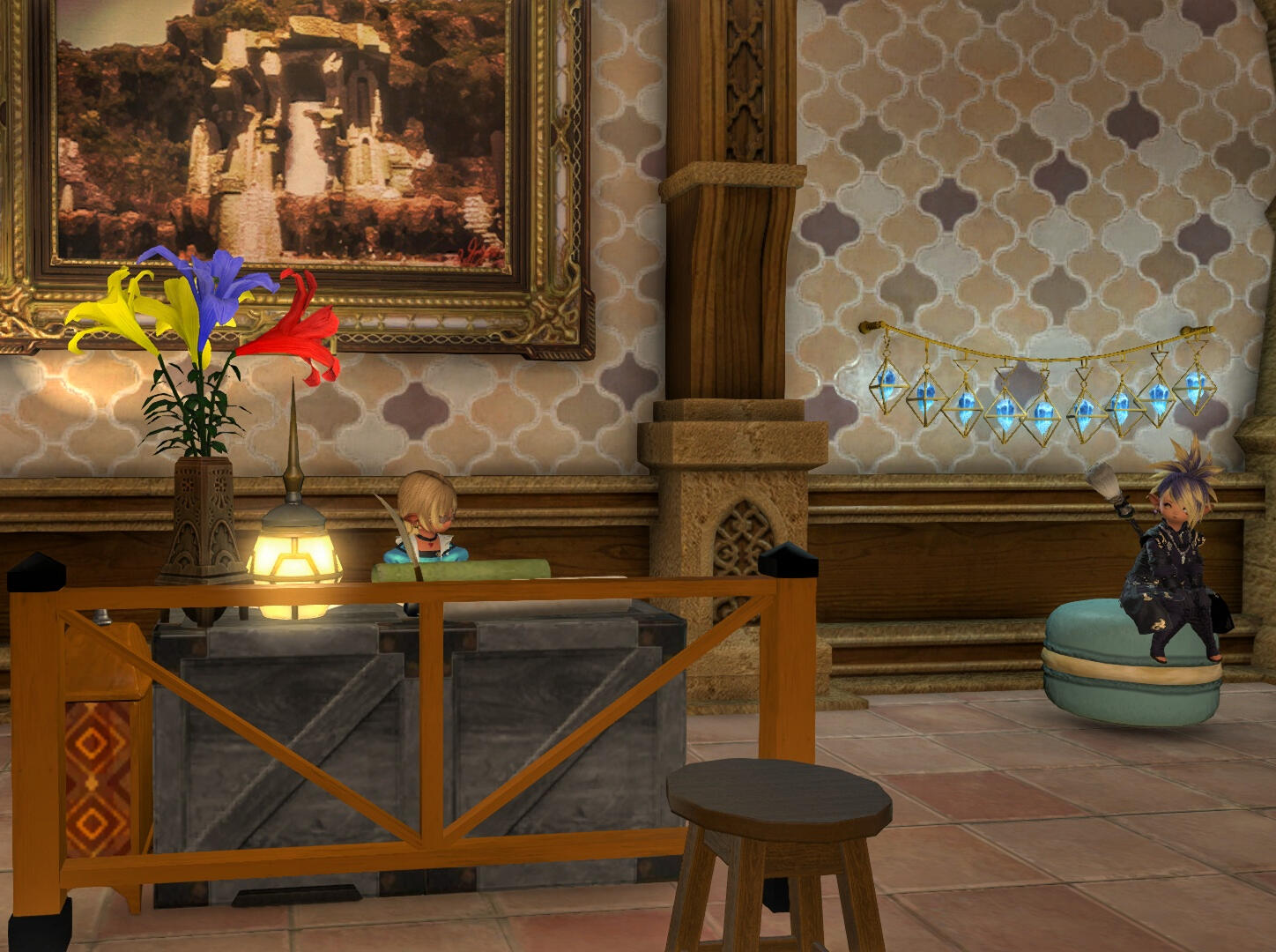 By the Gods, Ayame and Milleuda enticed so many guests to Factory! I'm so grateful Huckle Finn showed up because he was so very helpful in the lobby! There were times where I needed to excuse myself from my duties, and he was right there to entertain guests until I returned to be able to provide them the proper aethertenna frequency! Pray, he must needs apply for a job! I tried to encourage him, but he insists we would not be able to afford his wages. I must needs continue to insist!Cherry also showed up and we got to speak for a few moments. Constant interruptions of a steady stream of guests, though, does not make for good conversation.Luckily, she is patient.Oh man! A Lalafell walked into our lobby, she looked familiar, but I couldn't remember. She reintroduced herself as Jyx and offered me a gift: 50 popotoes! Fifty! She smiled and remembered how much I do love them. That was so very kind of her! My heart swelled up like a gigantic popoto, bursting with joy. I quickly stowed them inside the desk until I could retire to my room.Earlier in the day, I was traveling and swore I saw Genbu. Alas, it was not! But, it was another Au Ra that looked very similar. So, I asked if he knew Genbu...and he say "yes!" I invited him to join us that eve at Factory to reconnect and say hello. That night, he sent his sister ahead (I forget her name, but do recall it started with a "V")...and then HE showed up! Gorr. Gorr was his name, and he looked entirely different dressed for a night at Factory than when we met in Ul'dah. It turns out he knows another Genbu. Ha. Small world!At one point, Karaku summoned Nyx downstairs, so I escorted her (was she in trouble?) and I went back up to my duties and to keep Huckle company. He confided in me that he returned to his home and met with his family. His mother was so surprised he wasn't yet dead that she fainted! Ha! FAINTED! He insisted she was okay once she recovered, but he only stayed the day. I let him know he was oh so very lucky to still have his parents, and advised him both of mine passed when my siblings and I were very young. Family is so very important.Huckle invited a friend, a gigantic sort of man, I mean...he was massive! And his name was...um...something-Wall. How appropriate. Pray, how did he fit into the basement downstairs? Massive! Anyroad, he and Huckle eventually settled down to relax in the steam room while Nyx, Cherry, and I spoke on the couch.Milleuda. Oh, Milleuda. I met her briefly in Ul'dah before Factory opened to let her know that Ayame may be delayed for their intended tea date. And then she later showed at Factory as well. She is something else. Tall, elegant, kind, and she offered her assistance due to our lack of staff that evening. I will never understand how Ayame and Milleuda still had any voice left after the amount of shouting they had to do to advertise our event.At one point, Milleuda returned from wandering and fishing for guests and Huckle wagered a guess that her profession was assassin - or wait - "killer" was the word he used. She did have an air about her, and I hardly knew her...so I took a careful step behind this self-professed hero. I don't know what protected me more from her sight: his perfectly-coiffed pompadour or his broad shoulders. But, our tensions eased as Milleuda stated she is more of a chaplain. Much better than killer.As the bells droned on, I eventually couldn't keep my eyes open any longer. The constant stream of entering guests had dwindled down, so I excused myself from Cherry and Nyx's presence and entered the hall where the washroom, steam room, laundry, and my tiny bedroom reside. I loudly announced my presence in case Huckle and Mr. Wall had stripped down to their smallclothes or draped in towels - I was afraid the door may swing open at any moment. Luckily, they heard my call and exited the steam room fully clothed. In between apologetic yawns, I let them know I must retire for the eve, but not before Huckle asked me to settle a debate between he and Mr. Wall:"Just how did we afford such a luxurious house on an adventurer's salary?"I smiled and advised he must ask my employers that question; I was not privy to discuss such things.I fear there are so many details of the eve that I am forgetting...must be the Alphinade Huckle purchased for me. Goes straight to the head...Such a wonderful evening...WAIT...I forgot to retrieve the popotoes from the desk! I must needs make haste!