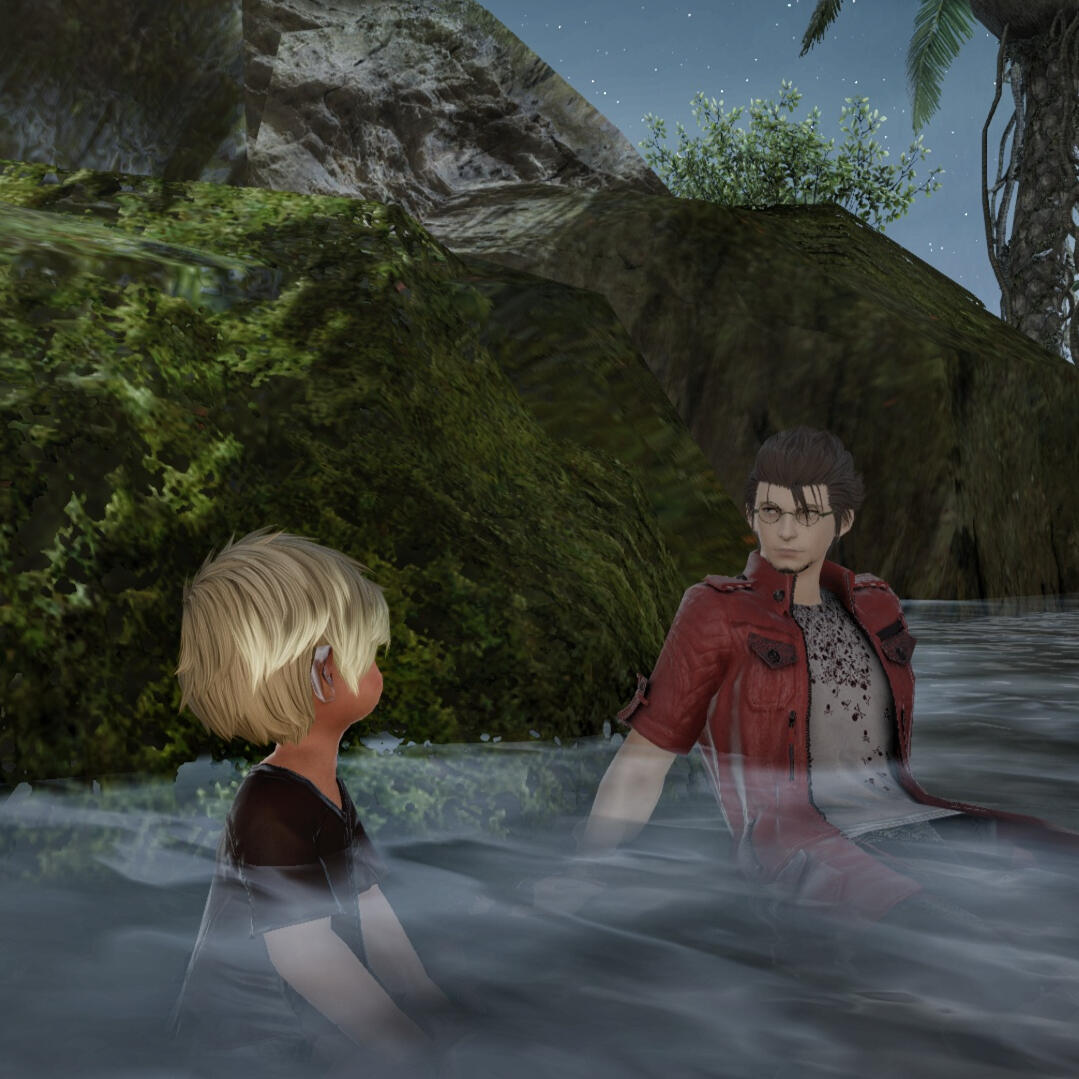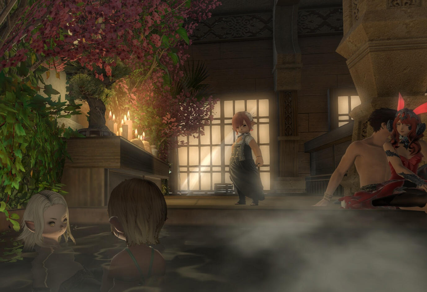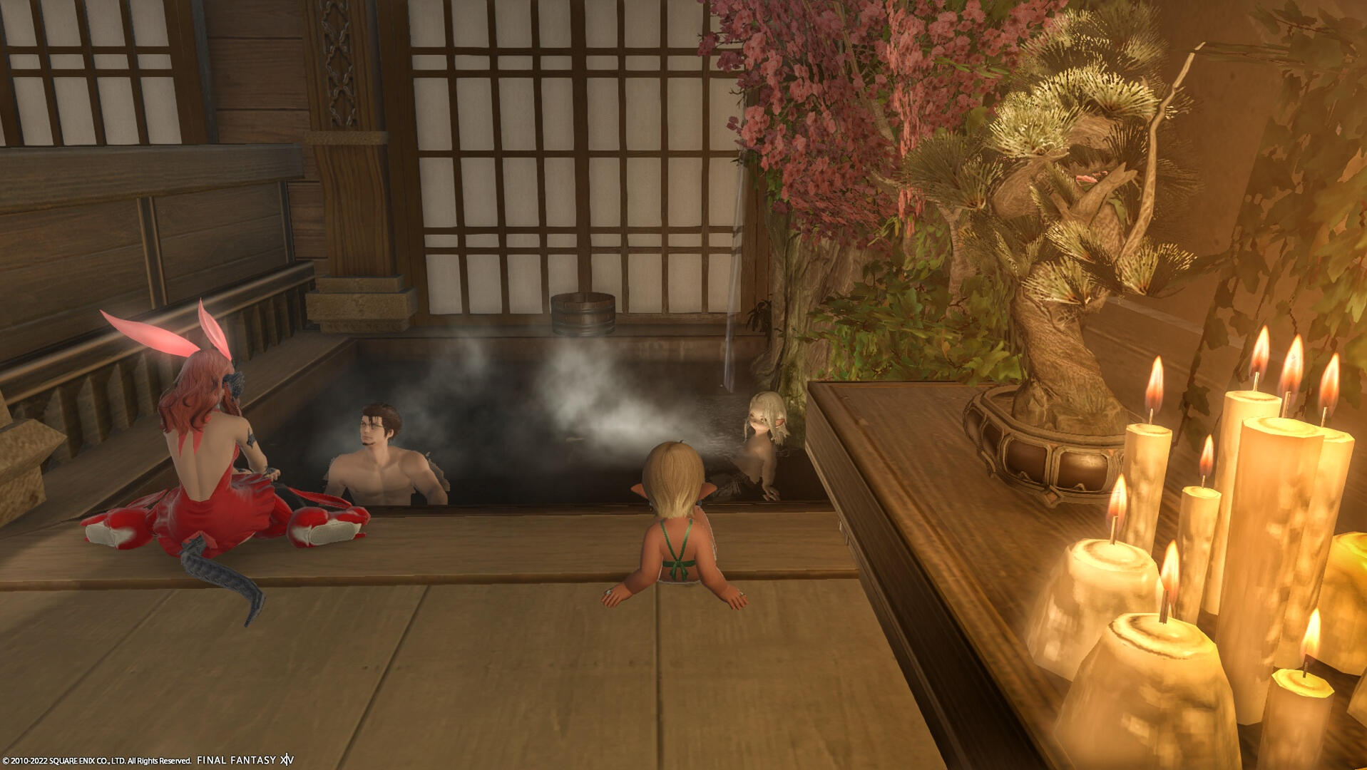 I've never had a massage before the other day.Solemn and I were perusing the ads in the Herald and found one for The Esuna Wellness Center. It talked about healing bath waters and professional massages.And no funny business!We arrived a little late since the proprietress already had customers lined up. But were invited to change into our swimsuits and enjoy the baths downstairs. Which, of course, we did. Oh, the things you learn about your friends while turning into prunes beneath warm waters.Did you know that Solemn had jet black hair in her youth? But it turned its signature silver hue in her 30s. To sport such beautiful hair for so long must feel a privilege. I know many a folk who pay good gil to have their hair match Solemns.Anyroad, we had guests in the nearby bath: a Viera and Hyur. They seemed rather cozy, chatting in whispers and nudges. Until the Hyur was whisked away upstairs for her massage.Bored of watching Nugget splash around in our pool, I sent a splash to our neighbor. Which set Solemn in a, well, solemn mood. So, groveling commenced and all was forgiven, and he even slipped into our bath to carry on conversation.Turns out his name's Mango. And it was his Nameday...which, of course, encouraged far more splashing.After a while Hana, the proprietress, came back downstairs with the woman in tow and escorted the Nameday Boy, Mango, upstairs. Turns out the Hyur was named Angel - well, it was more syllables than that, but she said we can just call her Angel.In walked an au'ra with hair as silver as my friend's and I watched Solemn hold his gaze as he slipped into the water. They babbled on about fighting for a while, I interjected a smidge about gardenin'. And soon Solemn was led upstairs.Mango literally melted into the floorboards, which occupied Angel in doting concern. So, the au'ra and I began talking. His name's Diamonte and although he favors fighting over all else, he made mention of Fates.So, I asked if he read palms. His answer was...vague...to say the least. But offered to read mine!