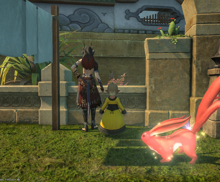 I received a ping on my ‘pearl that Zototo was in Idyllshire and wanted to meet. Luckily for him – or is it I – anyroad, I was ALREADY in Idyllshire delivering some items to a client. I meandered around my favorite spot (the fountain near the edge of town) before he let me know he was waiting at the aether plaza.I joined him there, and simply insisted that we return to the fountain since he’d never been. Much to my happiness, he obliged and it was a chase o’antelope and that same black chocobo to the long-forgotten corner of town.We took a moment to appreciate the view, not too long though as that bottomless drop is quite nauseating before retreating back to the safety and stability of the fountain’s edge.He let me know he asked me here to apologize for our last encounter having ruined my best (well, my only) dress. And that he had taken it upon himself to procure something in its stead, and something that may offer more protection! Something he’d even fancy wearin’ himself!He unfurled a beautiful piece adorned in various leathers, heavy cotton, and it even came with a beautiful deep green cape – one that nearly matched his own! It has a small spaulder on the shoulder to serve whatever purpose, but that’s the piece that gave me the most trouble. Eager to try it on, I insisted he turn around and keep watch. I had enough privacy in this far corner of Idyllshire to remove my tunic and fight my way into this – this – well, I suppose it IS armor? It’s like a shirt, but – more. Deep browns and greens – a tuft o’white assaults my chin from beneath the leather. The sleeves cover from the shoulder to the tip o’my wrist. Fully covered. And I daresay the cloak’s pin would serve as a weapon in a pinch!And, true to his word, he did not turn around. Well, I assume he didn’t – as my back also faced his. I announced I was once again decent, but that the piece felt tight, he helped poke and prod a few pieces better into place. I had no idea leather could be so stiff. It smells divine. Or is that Zototo?But, I love it! Oh so much! And cannot wait to resume our training!He wasn’t done…He surprised me! He said he had returned to Halatali and found my fallen Oldrose, and that it was yet still viable. He consulted with a friend versed in magick and they were able to propagate the oldrose! He gave me a planter box full of ‘em! Overflowing! Beautiful! Reds and deep pinks! Such a gesture! I’ve already had it hung o’er my bed so it’s the last thing I see when I close my eyes and the first I see when I wake.My errands could no longer wait, and as he had some mischievous glint in his eye and a smile upon his lips, I ran up, kissed his cheek, and mounted my farty stag: riding out of sight. The oldrose box was firmly lashed to ol’ Farty’s backside.I have since been able to stitch on a patch o’the Three Sisters Trading Company and will naught wear anything else while out and about on errands. Or training. I know another day is upon us soon. But when, dear Journal? When? Sometimes…sometimes I even sleep in it…