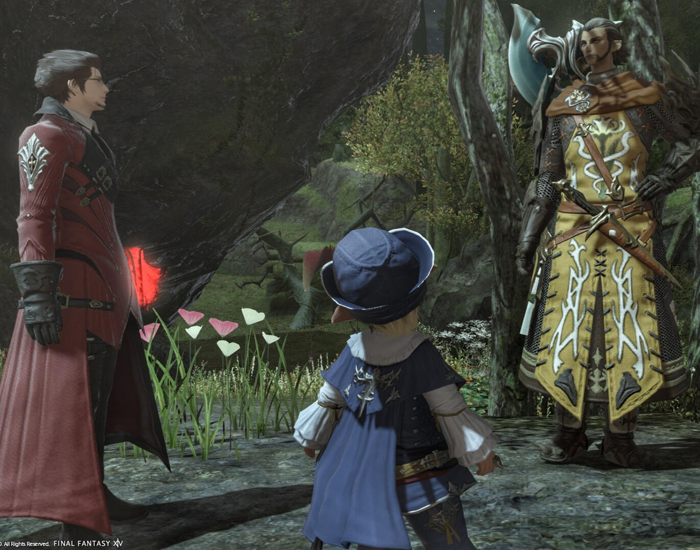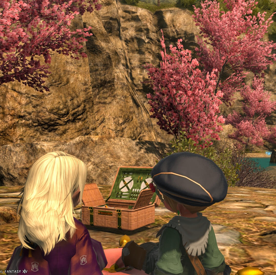 I've been putting off writing this entry for several suns.Huck and I met for breakfast at Gridania's inn. True to his word, he wore quite the ridiculous outfit: a pukey-shade of green shirt (which I actually really want) and a goblin mask! Big ol' ears and all! Ha. It was a sight to behold. I had secretly let Cherry know where we were meeting and she beat me to it! I found the two of them already sitting at the table. If memory serves, he ordered the Wailer's Morning breakfast and Cherry - well, Thall's Balls! - I can't remember what she ordered.I brought the steaming plates and Huck shoveled some of his impossibly-large portion onto my plate, too. How very kind of him. We also started off with some mornin' ale, although Cherry opted for a tea or something. I know I had some nerves for the day's adventures; mayhaps Huck did, too? The ale may have helped soothe my nerves...just an ilm.Anyroad, I spied my masked friend try to shovel eggs into his mouth - while still wearing the goblin mask. I couldn't help but laugh as he sheepishly removed it and ate more delicately. As I once tried to describe to him, I shoveled my breakfast into my mouth as fast as I could (imagine if you will a smallshell devouring whatever it is they eat so greedily). Growing up with my brother, sister, an adopted siblings: if you didn't eat fast, you didn't eat at all - it had already all been claimed!Huck spoke with Cherry awhile about Nyx and the night they shared. It was glorious to see her blush. Mayhaps more than friendship blossomed betwixt the two book lovers! We also talked about Huck's skincare cream, which sent him off and away in a hurry so he could further tweak his formula.Cherry and I talked for a while longer, as I confided my jitters and fondness of Huck. She said it wasn't that hidden...oh gods, I wonder if he knows? Before long, I took my leave as well to begin the journey to our portrait sitting.Camp Bronze Lake was the agreed-upon location with Sani, the artist I was telling you about earlier. It was raining. Pouring, actually. But you could still make out the backdrop of the waterfall through the falling drops. Huck and I arrived, but she was nowhere to be found. Rather then wait, he scrambled off to some errands while I waited. Eventually, she arrived, uttering apologies for having overslept. I pinged Huck on his link pearl, and he let me know he was on his way back.This gave Sani and I a chance to talk about the piece. I let her know Huck's grand idea for something that would calm our guests, which of course included his face. Ayame had suggested I, too, wiggle into the sitting, to which Sani agreed. Huck and I had discussed it over breakfast. It was bound to happen as Sani had no objection!Huck arrived and it was still raining, so I stepped over to shield his pompadour from the assaulting water pouring from the sky. It was awkwardly close. And I do believe I blushed. Or mayhaps it was the chill in the air dancing across my cheeks?Sani found the perfect location that both kept us out of the rain (although she stood fully in it the entire time!) and showed the beautiful falls behind us. She left the decision of our pose up to us! After much debate and indecision, she suggested Huck sort of kneel in the flowerbed and I sit, laying my head upon his shoulder. Two Lalafell, surrounded by blooms, serving as the foreground to the majestic falls of Camp Bronze Lake. Sani was certain it would cast a calming presence in our Embassy's steam room.Amazingly, the canvas and her paints were not blemished by the falling rain. Her partner, Shade (I think his name was...) had treated her tools o'her trade in some alchemical manner as to protect it all. There she stood, an Au Ra beautifully attired in a golden yellow dress and pale blue sleeves (which matched her facial tattoos). Her eyes, though, I'll never forget: pupiless. Unnerving. And yet, as she appeared blind to me, she obviously wasn't. She was able to observe Huck and I, greet us directly, and paint - by the gods, did she paint! Fluid, dance-like movements - at times she hummed in the rain - she'd peer from behind the canvas, analyze some angle, then get right back to painting. It was neat to watch!And, oh, being so near to Huck...stationary, unable to move, my face resting on his armored shoulder - I mean, I won't lie: it was uncomfortable. His armor was hard. But his body temperature seeped through. But, oh it was so wonderful. At times, he'd shift his weight and I'd shift with it. Trying to keep the original pose. A sort of shifting, sitting, warming dance. Rain? What rain? Cold? Never - I was flush with warmth. I mean, I was so close I could smell his skincare oil mere ilms from my nostrils. I pray Sani did not capture my ongoing blush in the portrait...She began to speak of her partner, Shade. And the tone of love she emitted was inspiring. I bet it could end wars, soothe angry beasts, and charm all of Eorzea. I commented how obvious it was that they were in love, and Huck shot some snide remark that I should never be that...I think he said soft. Or was it smitten? Holy popotoes!!! But - but - Did he know?! I was grateful he couldn't see my expression, but Sani stepped up to my defense and said I was, "...as hard as the stones I pluck from my garden." I do believe she smiled slyly my way. That quickly shifted the conversation to my throwing arm and the pebbles I hurl at rats. Whew...Eventually, she announced she had finished! Just as the rain ceased. By the gods - did she wield control over the weather? We both stretched the kinks out of our stiff muscles and ran over to look. It was spectacular!!! She gave strict orders to store the canvas in a room that wasn't the steam room just for one sun as it cured. Then we could frame and hang it up in it's intended destination!I had forgotten that Sani said she also reads runes! And Huck and I took her up on the offer to have our fortunes told. But, alas, dear Journal, my hand tires from all of this writin