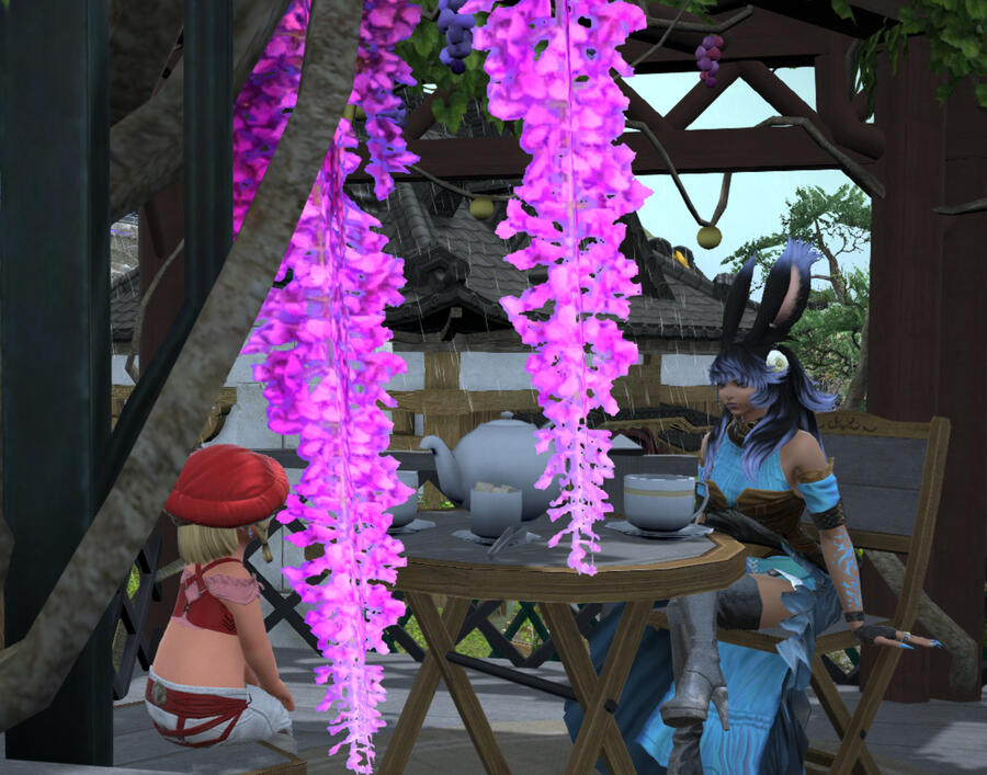 I sat alone at a gorgeous wee tea-table outside and was joined by the most pleasant Viera, named Julianna. After we spoke for a bit, I learned she was to be sent off to the highest bidder. The waiter soothed my fears of sex trafficking, but instead this was a consensual auction among patrons. Julianna was a volunteer. And offered a casual date to the highest bidder.All the staff were to be up for auction that eve! The minimum bid? 100,000 gil. Ouch.But, to draw in the crowd and prospective bidders, hence the free food and beverage.Julianna ordered for us: Zodiark's Embrace (a strong wine made of purple carrots) and Cubus.Our Miqo'te waiter (who would also be up for auction later) explained it's a fancy name for a fig-covered cheesecake. Then later went into great detail of the origins of the name: after some long ago ancient slime. Speaking of which: I devoured my Cubus in my usual face-shoveling fashion and E'met (the waiter) summoned a wee cubus slime o'his own to vacuum up the cheesecake crumbs on the ground. It was glorious!Just as I was to take my leave before I fell prey to a cheesecake-induced nap, E'met mentioned there are aether readings held at their venue.Now, I've had tarot, rune, palm, and tea leaf readings; but NEVER an aether reading.He pointed me to another nearby table, also occupied by a Viera and a Miqo'te. The Viera's name was Emet' - all very confusing and far too similar for my tastes. Emet' explained that aether readings are a very time-consuming and private affair - and rather than assess something as simple as what the Fates have in store for your love life or future ventures - they -They read the aether and divine the future of your health and make nutritional suggestions to ease the journey.Amazing! I'd never heard such a thing! It will take nearly all of my gil, but I shall be in contact with E'met (the original waiter) to schedule a time and place for my aether reading.Things got busy at the hostelry very quickly. Emet' had to leave to greet guests and the Miqo'te at the table, Baj'a, was drafted into service.I wished Julianna all the luck and head out before, I too, was asked to help serve. And far too many Emets: E'met and Emet' for my wits.